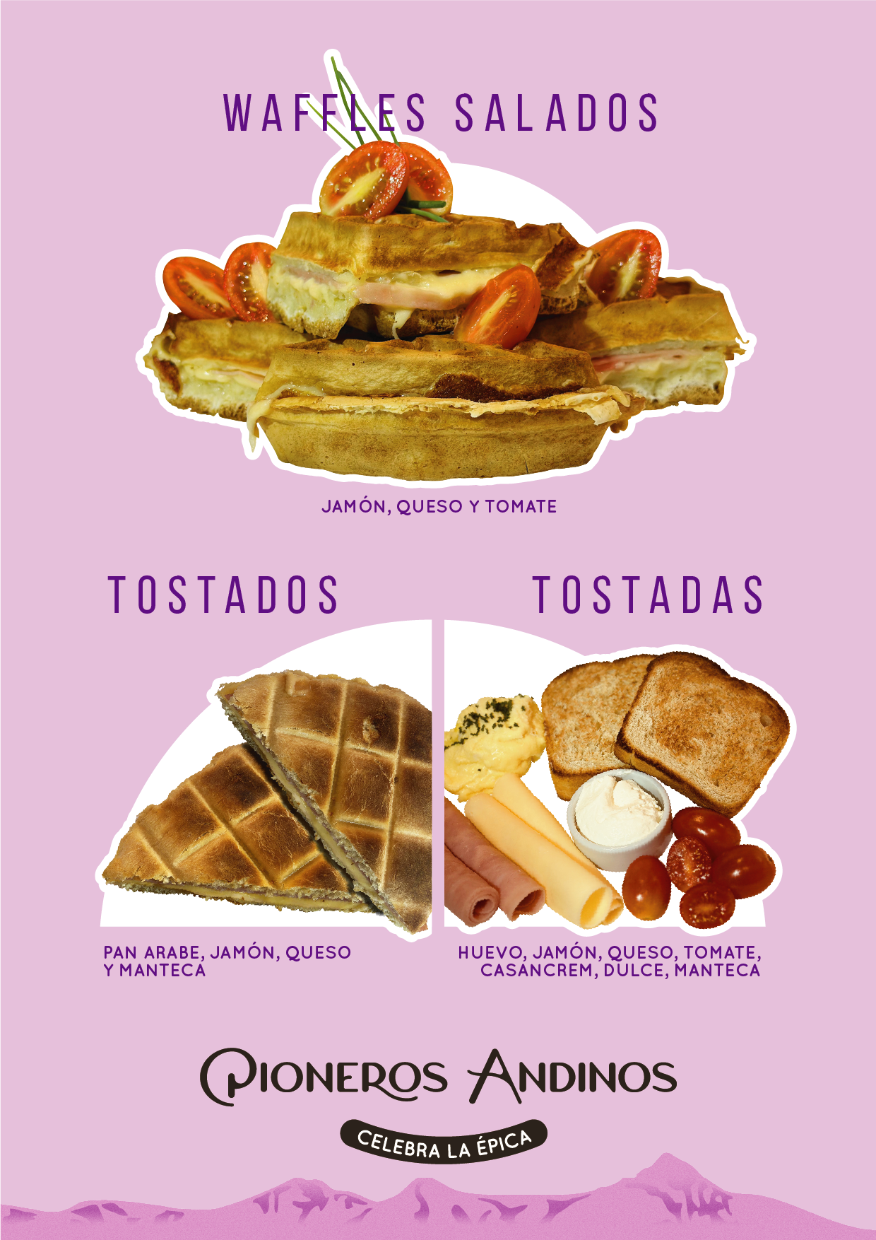 Pioneros Andinos, carta de waffles saladosm sandwiches y pan tostado